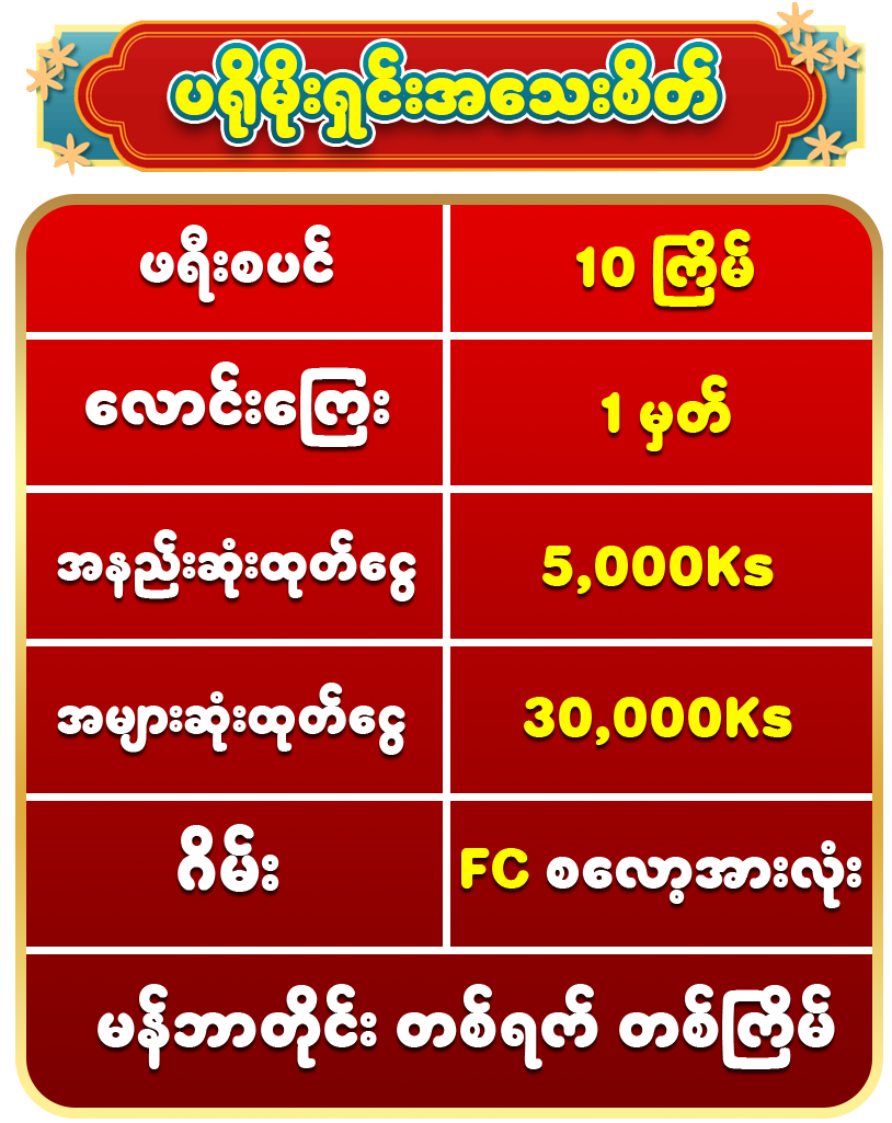 ✅ ပ႐ိုမိုးရွင္းအား 01/01/2026 မွစၿပီး တစ္ရက္လွ်င္( ျမန္မာစံေတာ္ခ်ိန္ (10:30 P.M To 10 :30 P.M ) ႐ိုး႐ိုးသြင္းေငြ 10,000 Ks သြင္းကစားထားေသာ မန္ဘာတိုင္း ေနာက္ေန႔ မွာ customer service သို ဆက္သြယ္ ရယူႏိုင္သည္